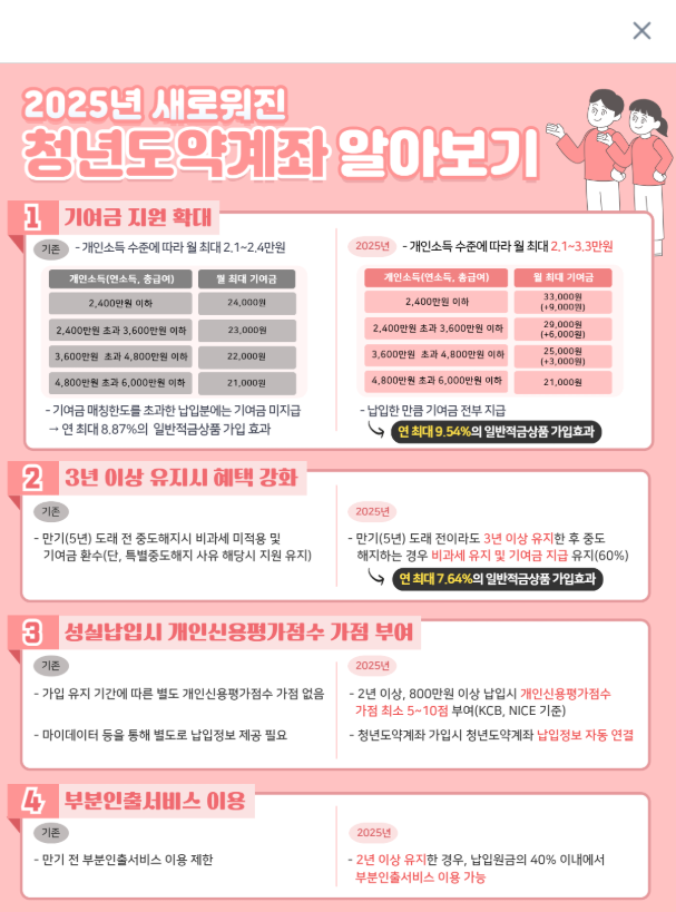 특히 2025년부터 청년도약계좌의 기여금 지원이 확대되고, 부분 인출 서비스가 도입되는 만큼 빠르게 신청하는 것이 유리합니다.
