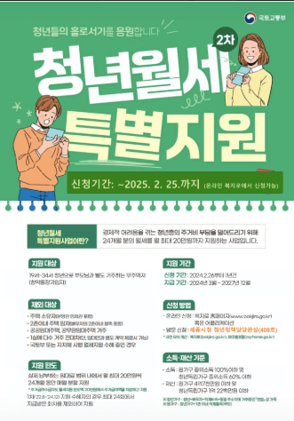 청년들의 주거비 부담을 덜어주기 위해 정부가 2025년에도 청년 월세 한시 특별지원 사업을 연장했다. 청년들의 주거비 부담을 덜어주기 위해 국토교통부와 복지로에서 청년 월제 지원 사업을 시작한다. 이번 기회를 놓치면 받을 수 없는 최대 480만 원의 지원금! 지금 바로 신청 조건, 신청 방법을 확인하고, 서둘러 월세 지원 혜택을 받아보시길 추천드립니다.